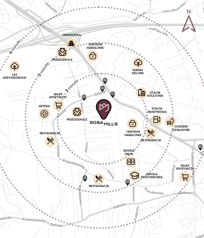 Okolica Rosa Hills dynamicznie się rozwija w odległości 5 minut jazdy samochodem znajdziesz sklepy spożywcze, m.in Lidl, bankomat, stację paliw, market budowlany Leroy Merlin, sklep z wyposażeniem wnętrz Maxfliz, a w najbliższych latach przy ul. Krakowskiej planowana jest budowa największego Centrum Atut w okolicy, który będzie mieścił 25 lokali handlowo usługowych.