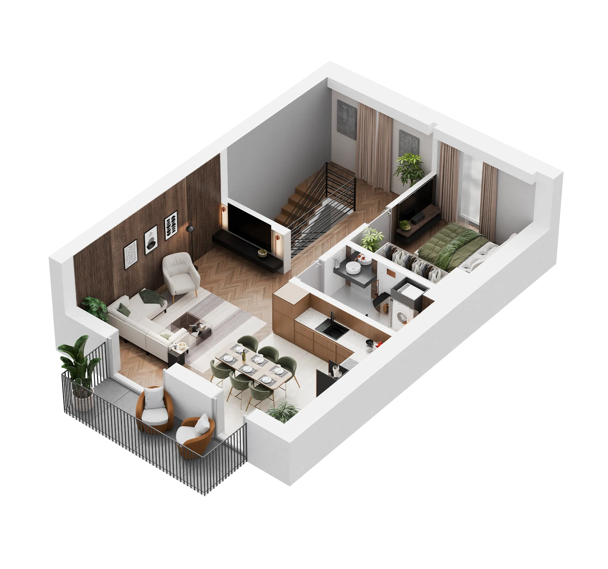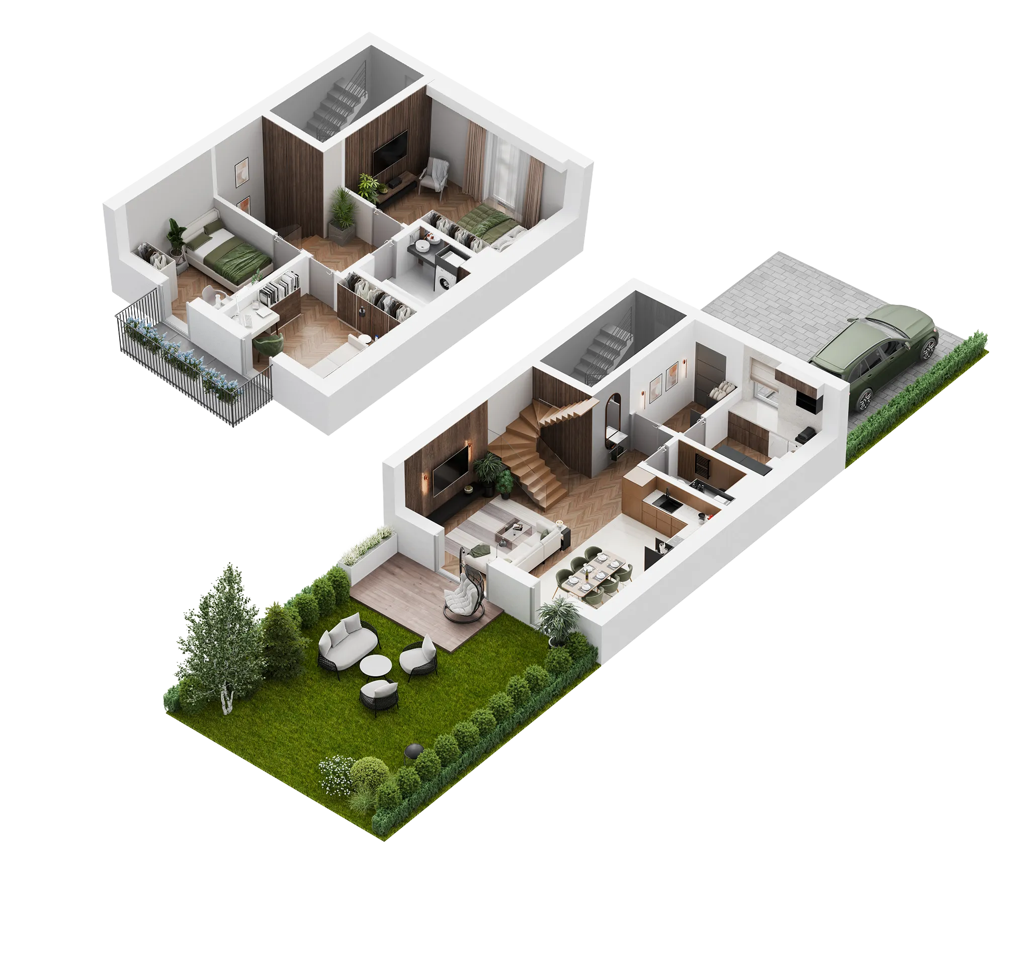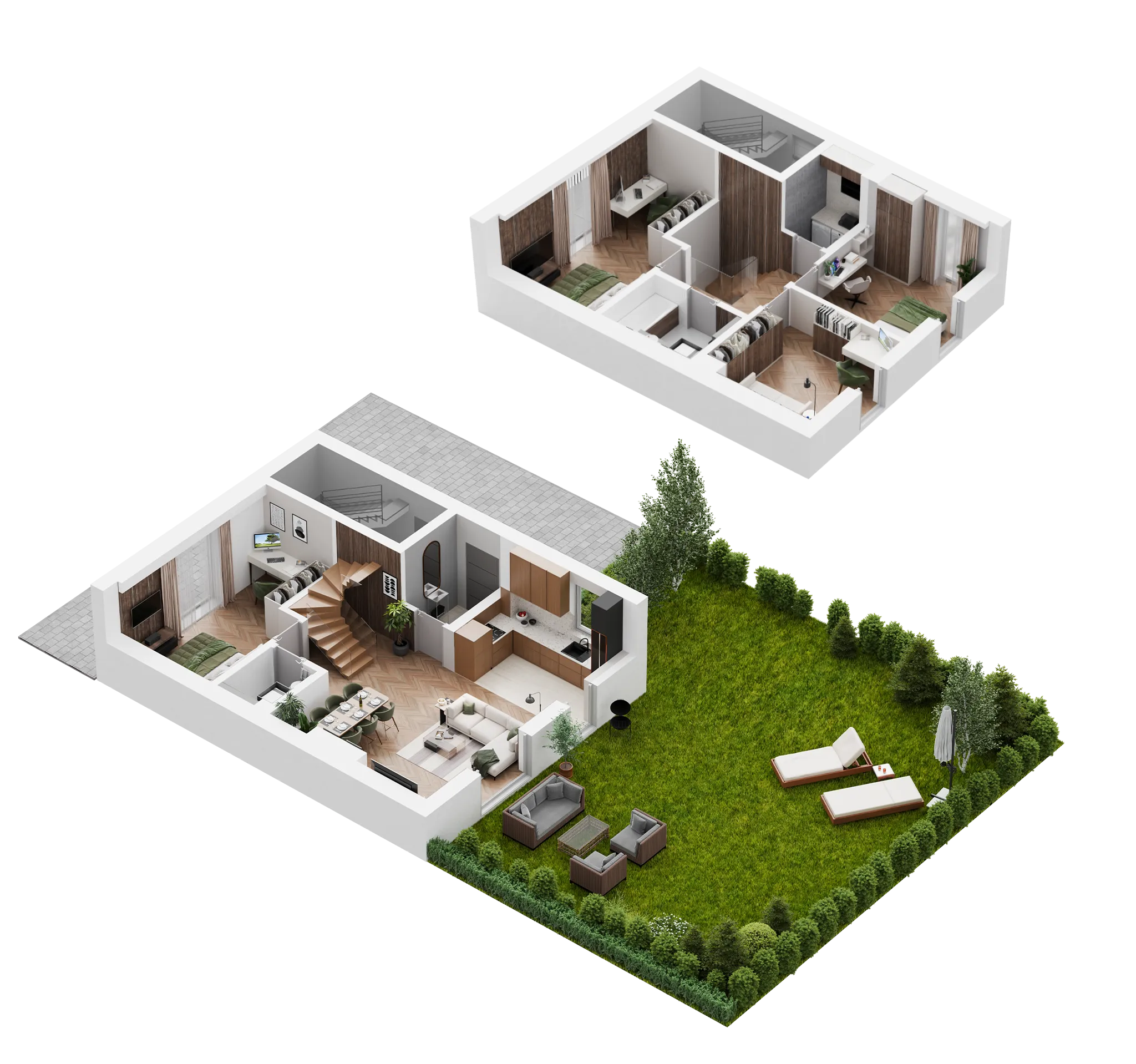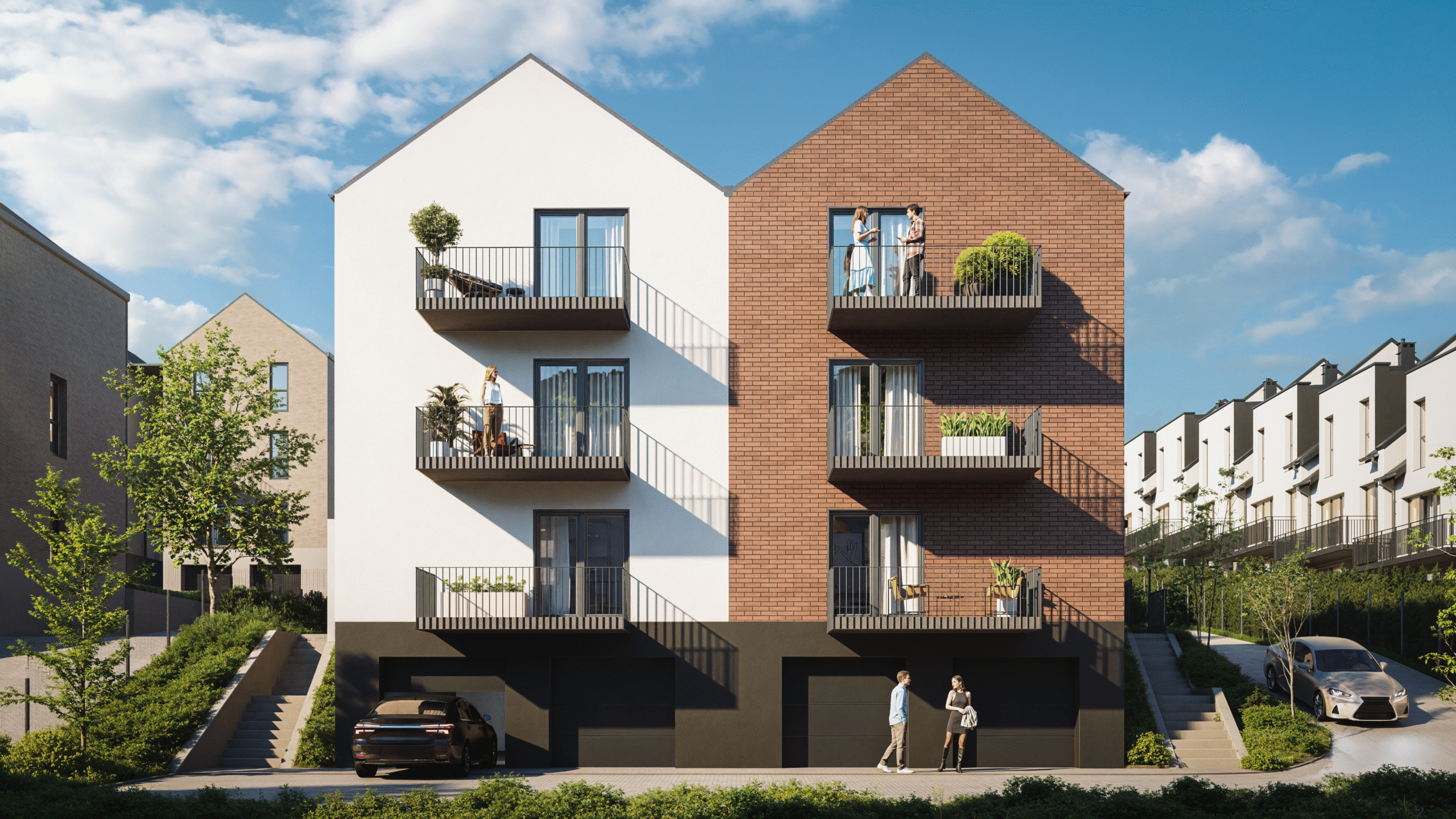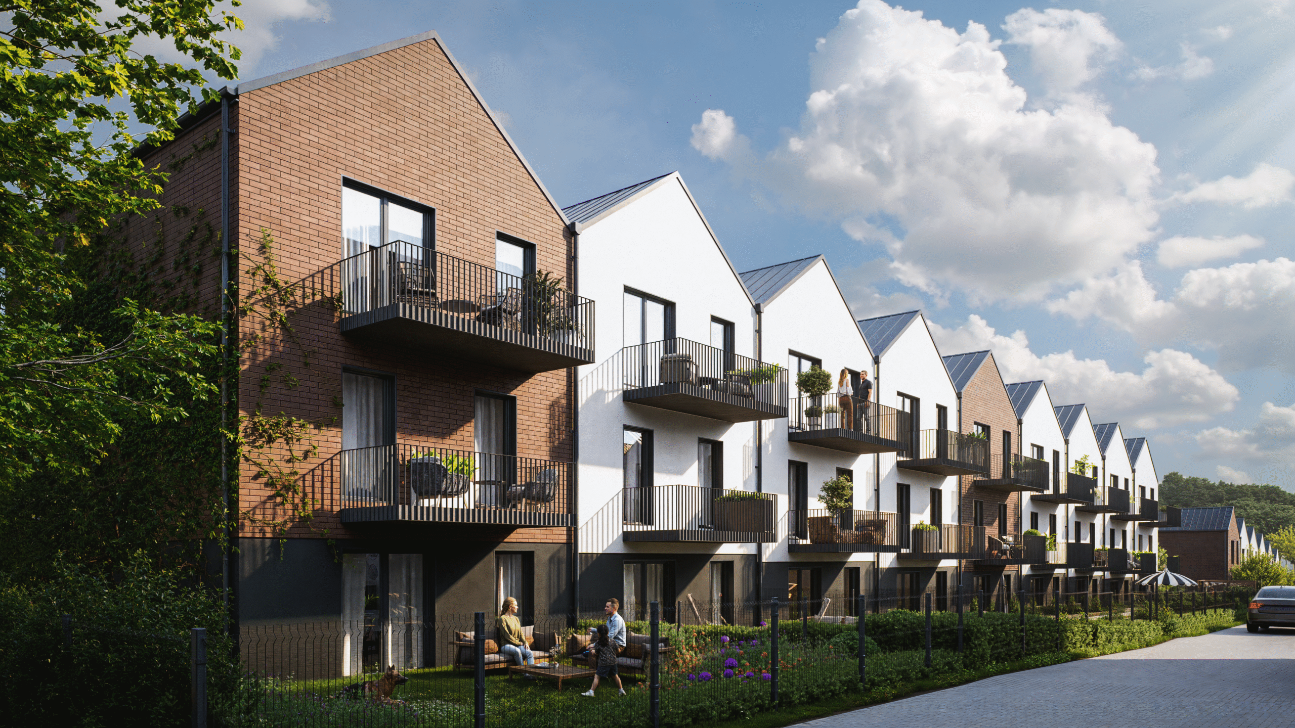Dwa typy mieszkań – większe, dwupoziomowe z ogródkiem, oraz mniejsze, z balkonem i dodatkowym pomieszczeniem do przechowywania na poddaszu – dostosuj swoją przestrzeń do potrzeb i etapu życia.